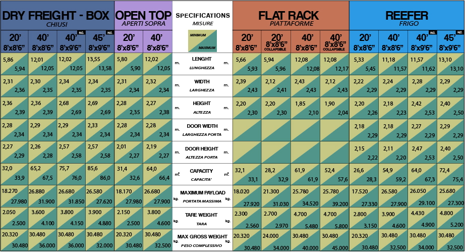 集装箱服务包括20'和40'整货柜装载。各种设备:箱/开顶箱/高货柜/冷藏箱/板架